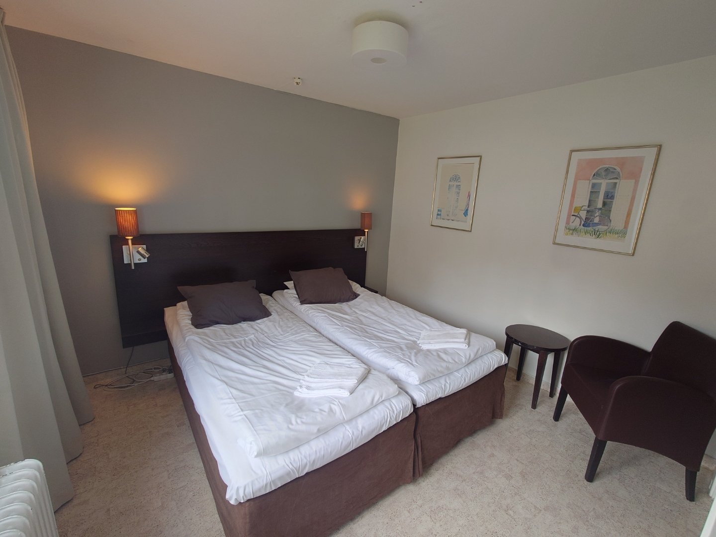 Rum med en dubbelsäng/2enkelsängar handfat på rummet. Dusch, kök, WC och TV i gemensamhetsutrymme. Handikappanpassad entré och toalett.