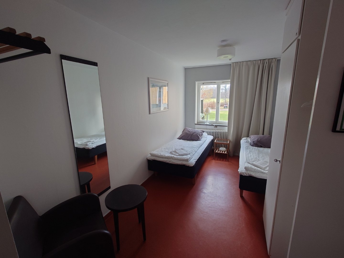Rum med en dubbelsäng/2enkelsängar handfat på rummet. Dusch, kök, WC och TV i gemensamhetsutrymme. Handikappanpassad entré och toalett.